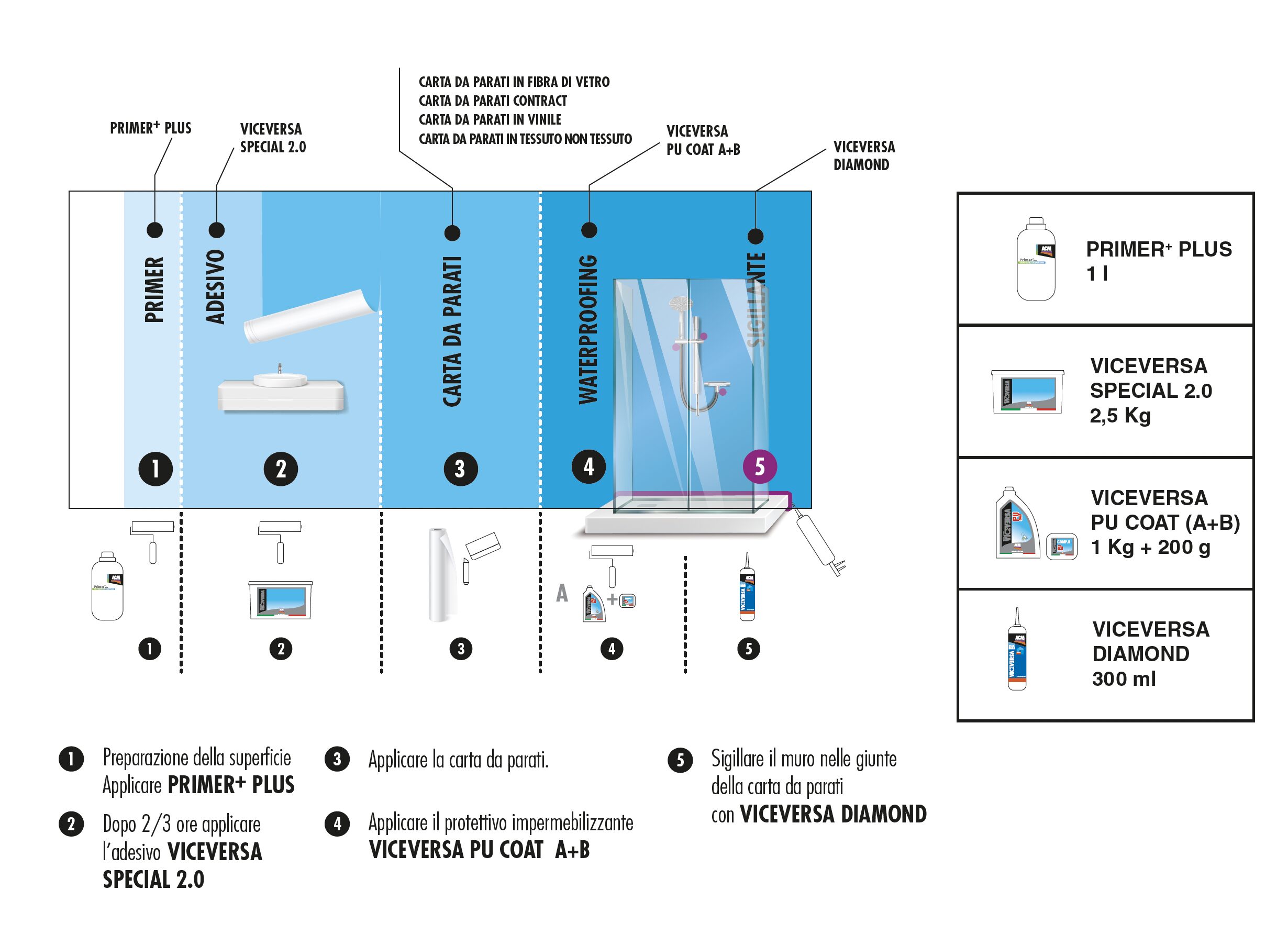 VICEVERSA WET SYSTEM È UN SISTEMA COMPLETO E SICURO PER LA POSA DI FIBRA DI VETRO DECORATIVA E CARTA DA PARATI VINILICA CON QUALSIASI TIPOLOGIA DI RETRO IN AMBIENTI UMIDI E/O A DIRETTO CONTATTO CON ACQUA (COME DOCCE, SAUNE ECC.).